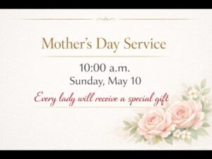 We will have a special service on Mother’s Day, May 10, at 10 a.m.  All ladies will receive a special gift.  There will be no services that evening.